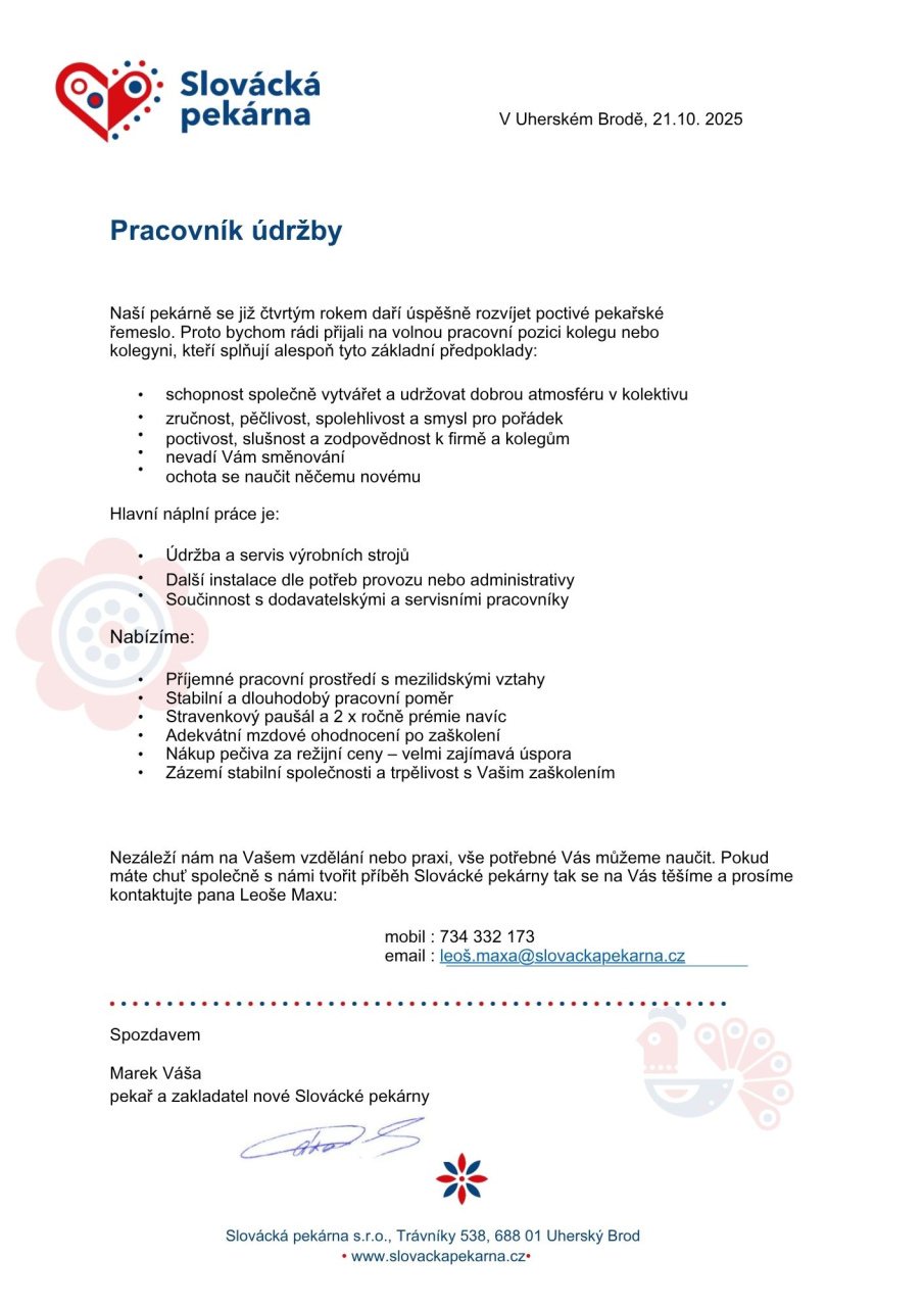 Pokud máte chuť společně s námi tvořit příběh Slovácké pekárny, tak se na Vás těšíme a prosíme kontaktujte pana Leoše Maxu: